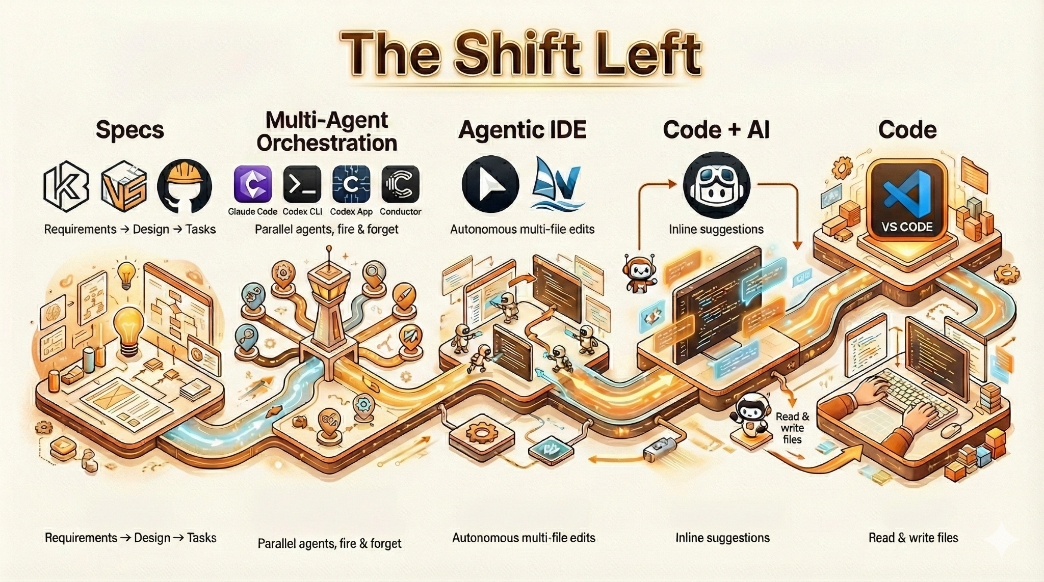 Code (right side): Traditional IDEs. VS Code, JetBrains. You read code, you write code.